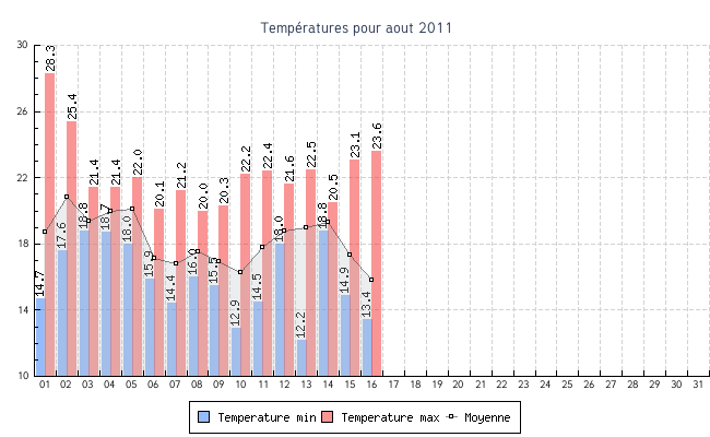 | 01 | 14.7 °C | 28.3 °C | 18.7 °C | 3.8 km/h (17.6 km/h) | NNE |