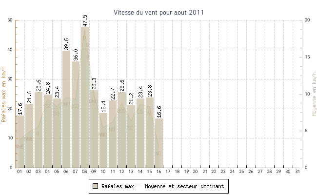 | min | max | moy | Vitesse (rafales) | Secteur | ||